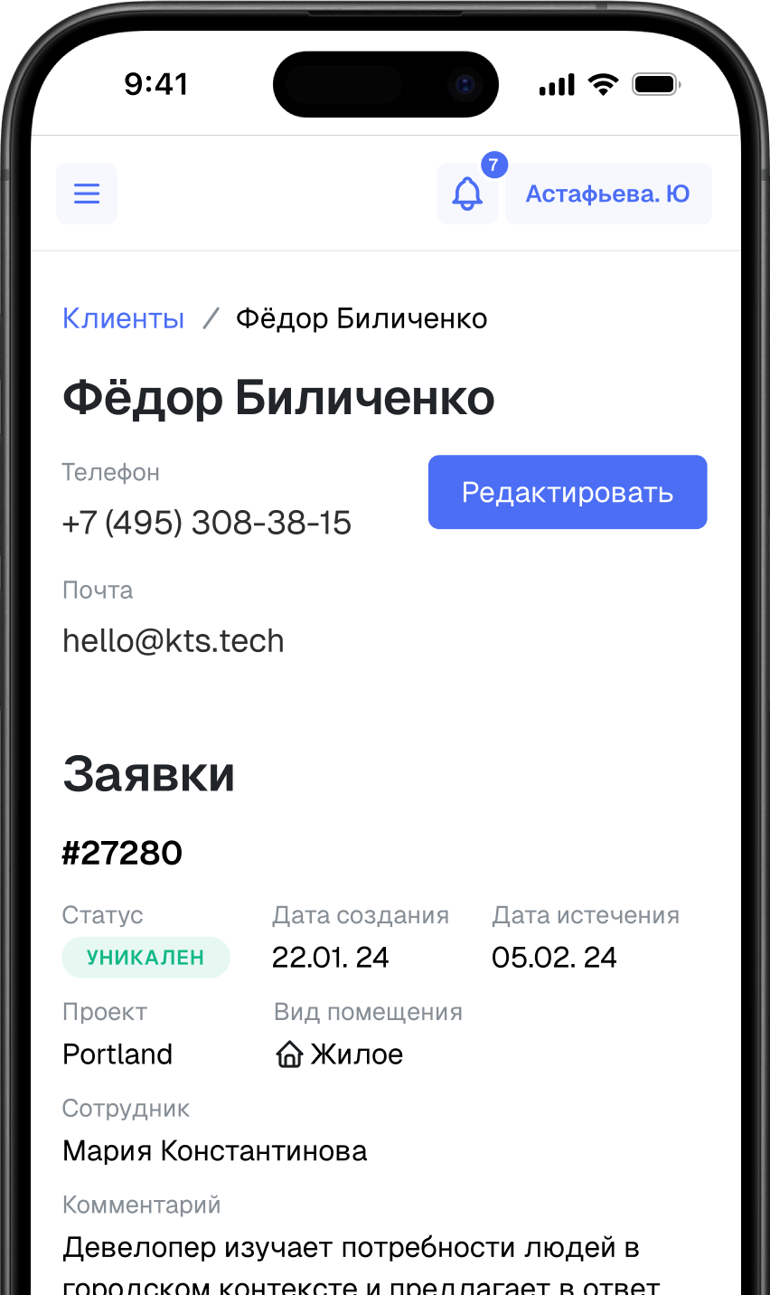 KTS.Агент — личный кабинет брокера. PropTech-инструмент, который дает девелоперу полный контроль над партнерским каналом и позволяет масштабировать продажи без роста затрат. Решение приносит ощутимый результат уже в первые месяцы: — приток новых агентств увеличивается в 4,5 раза — объем новых заявок вырастает на 100% — команда экономит десятки часов рабочего времени еженедельно KTS.Агент подходит девелоперам, которые хотят видеть прозрачную воронку агентских продаж, исключить потери клиентов и оптимизировать нагрузку на команду. Разработка обеспечивает автоматизацию фиксаций и встреч, уведомления и контроль клиентской базы. Развёртывается в выделенном облаке KTS, не требует покупки экосистемы и легко кастомизируется под брендинг и бизнес-процессы.