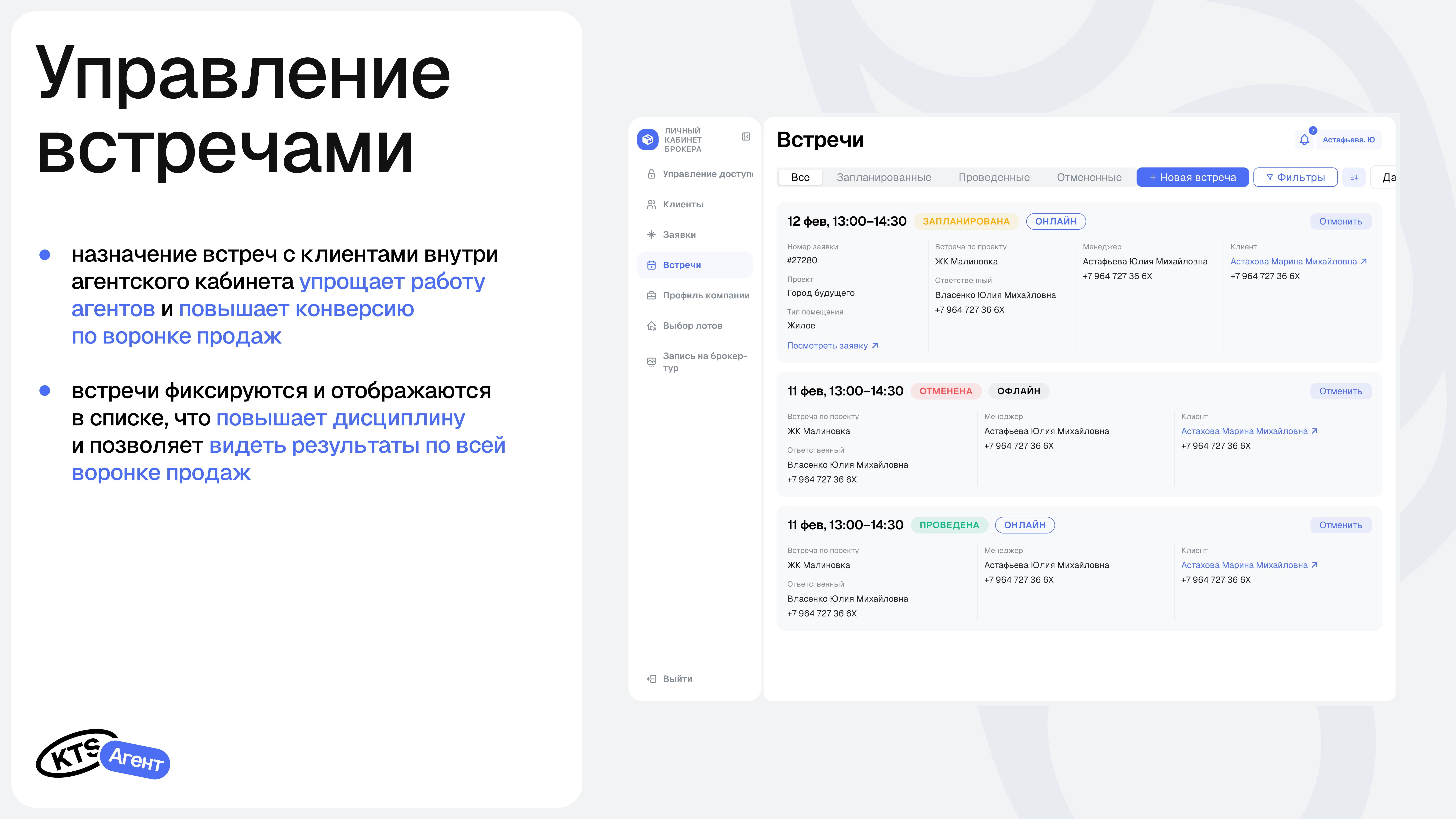 Подходит девелоперам, которые хотят видеть прозрачную воронку агентских продаж, исключить потери клиентов и оптимизировать нагрузку на команду. KTS.Агент обеспечивает автоматизацию фиксаций и встреч, уведомления и контроль клиентской базы. Развёртывается в выделенном облаке KTS, не требует покупки экосистемы и легко кастомизируется под брендинг и бизнес-процессы.