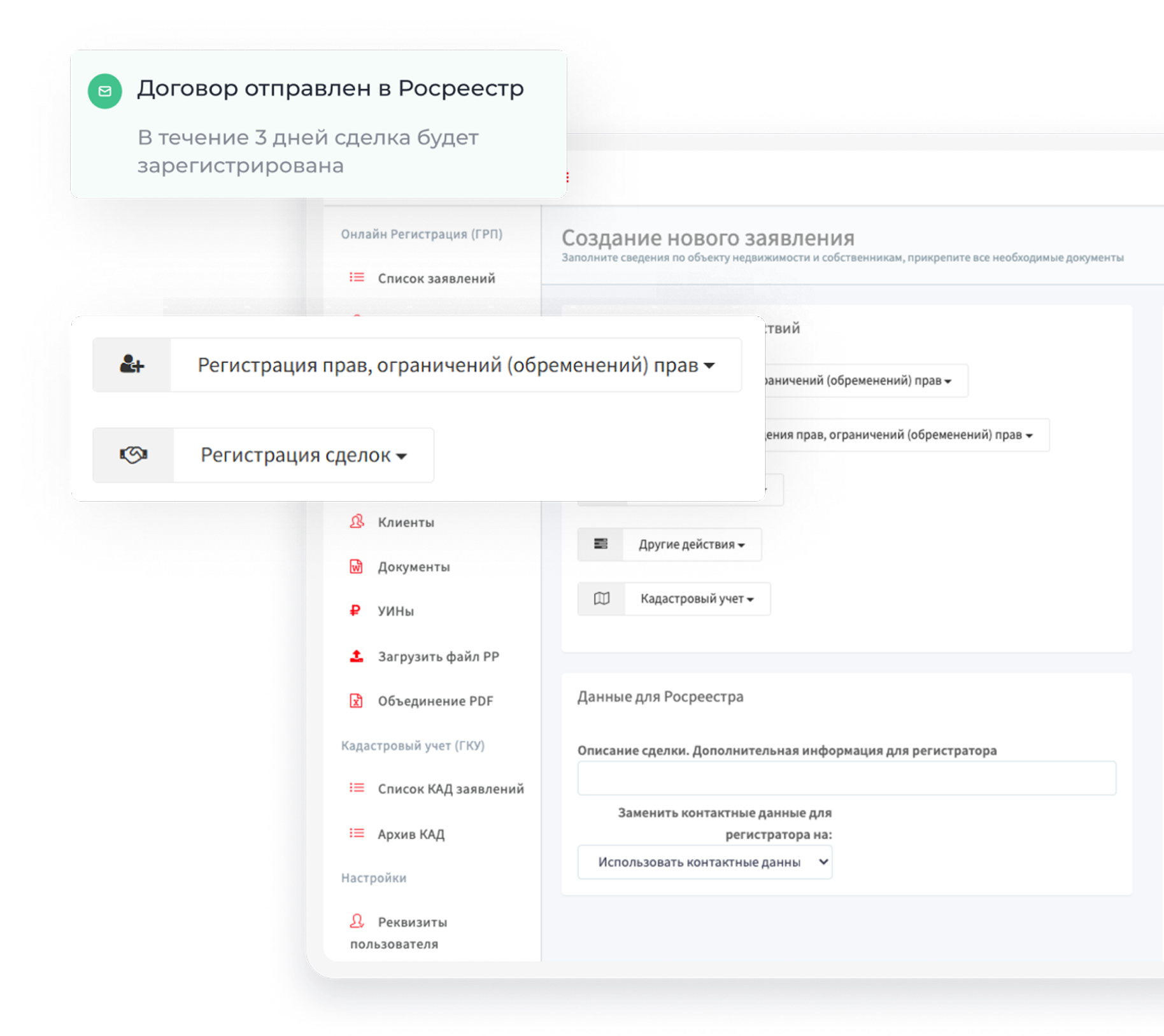 • Работа со сделкой и отправка заявления в Росреестр происходит в одном окне CRM.